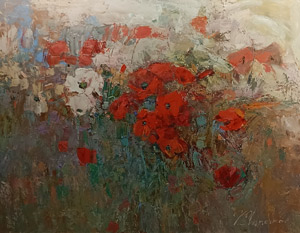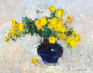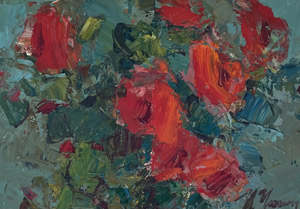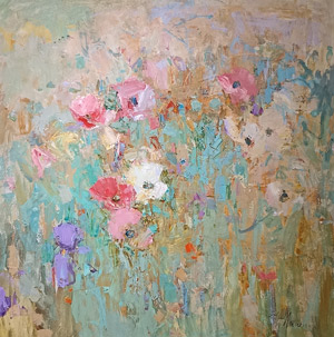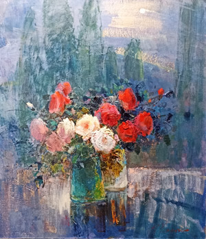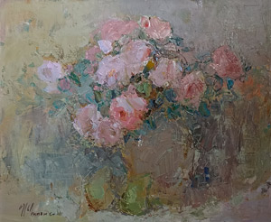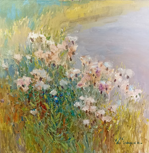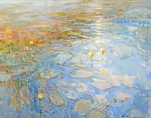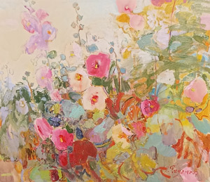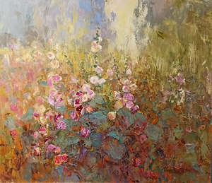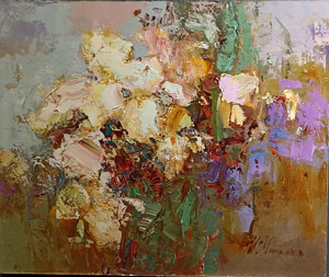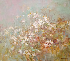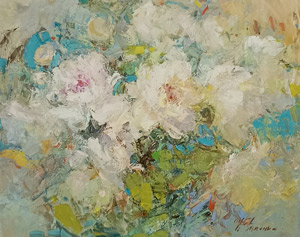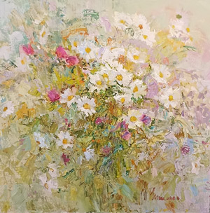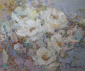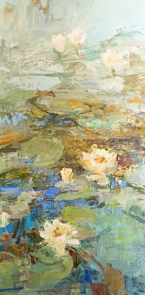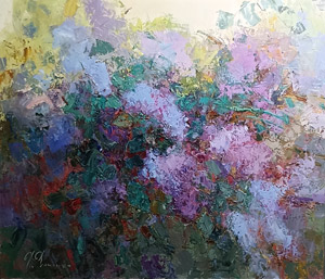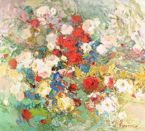 Главная тема творчества автора-Цветы. Будь то букеты в вообще, кувшинки на воде или садовые цветы, зритель мысленно угадывает в размытых и перетекающих лепестках цветочную композицию. Лишь от общего ощущения , мазки собираются в мастерской линую картину.
