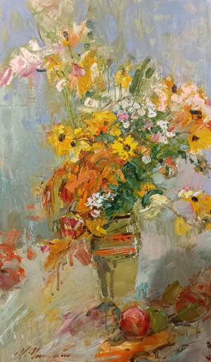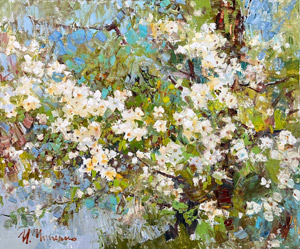 Художник работает в технике масляной живописи, умело используя кисть и мастихин, сочетая фактурно-пастозные мазки с легкой прозрачной пропиской.