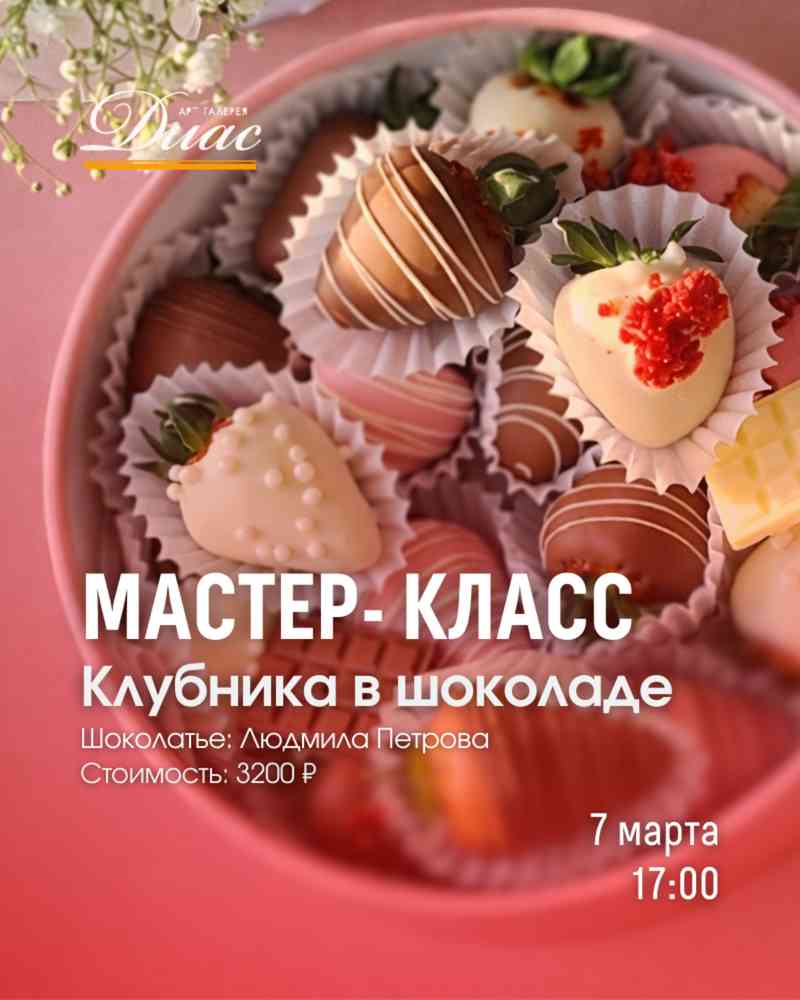 7 марта в арт-галерее «Диас» состоится мастер-класс по созданию клубники в шоколаде под руководством профессионального шоколатье.