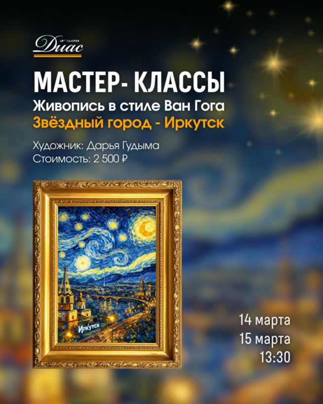 Приглашаем на мастер-класс по живописи в стиле Ван Гога - создадим свою версию «Звёздной ночи» и перенесём Иркутск в атмосферу легендарных картин.